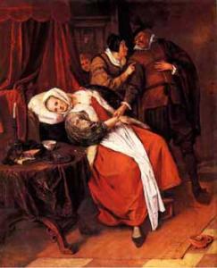 Стен. Более широким по тематике, демократичным бытописателем был Ян Стен (1626/27— 1679), художник темпераментный и жизнерадостный, создатель картин на сюжеты из частной жизни бюргеров, предпочитавший изображение сцен пирушек и народных праздников. В таком же духе он трактует и библейские сюжеты, перенося действие в современную ему голландскую действительность и оживляя их юмористическими эпизодами. Его мастерство в обрисовке характеров ярче всего проявляется в интимных камерных картинах, таких, как «Больная и врач» (ок. 1660 г., Амстердам, Рейксмузеум), привлекающая искренностью чувств, красотой живописи, легким юмором.
