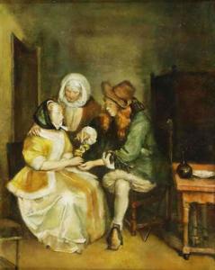 Терборх. Метсю. Если бытовой жанр Остаде и Стена носил более демократический характер, то в искусстве Герарда Терборха (1617—1681) и Габриэля Метсю (1629—1667) преобладает интимно-лирический подход к тематике быта зажиточной буржуазии и патрицианских семей. Эти художники с поразительным мастерством изображают фактуру различных материалов — упругих шелков и муаров, дорогих ковров и мехов. Их манера повествования медлительна и спокойна. Не отличаясь глубиной содержания, картины Терборха построены на обрисовке характеров и взаимоотношений действующих лиц более тонких, чем у Метсю. Его «Бокал лимонада» (между 1655 и 1660 гг., Ленинград, Эрмитаж) и «Деревенский почтарь» (Ленинград, Эрмитаж) содержат элементы недосказанности, своеобразного поэтического очарования, которое определяется эмоциональным состоянием, связывающим персонажи картины.