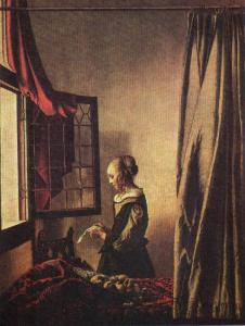 Особенно гармонична и ясна по композиционному построению «Девушка с письмом» (конец 1650-х гг., Дрезден, Картинная галерея), картина, насыщенная воздухом и светом, выдержанная в бронзово-зеленых, красноватых, золотистых тонах, среди которых сверкают желтые и синие краски, преобладающие в натюрморте переднего плана. В отличие от теплого, мягкого света, как будто излучаемого самими объектами изображения в картинах Рембрандта, Вермер заливает весь интерьер комнаты холодным дневным светом. Он четко моделирует объемы предметов, выявляет фактуру поверхности каждого из них. Благородству, жизненному богатству и сдержанности всего строя художественного произведения соответствует образ спокойной молодой женщины, погруженной в чтение письма, неразрывно связанный с состоянием тишины и покоя, воплощенными в этой картине.