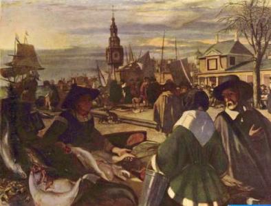 Де Витте. Среди голландских мастеров бытового жанра выделяется своей верностью демократическим идеалам и новаторскими поисками Эмануэль де Витте (1617—1692), в искусстве которого наметились тенденции к более широкому образному охвату явлений действительности. Сначала художник писал в красивой жемчужно-сероватой, холодной гамме церковные интерьеры, мастерски нарисованные, оживленные фигурами молящихся прихожан. Но интерес к различным сторонам жизни вел его на улицы городов, на рынки, где торговцы предлагают всяческую снедь многочисленным покупателям. Так постепенно в искусстве де Витте складывается особый вид бытового жанра — изображение рынков. «Рыбный рынок» (1662, Лондон, Национальная галерея), «Рынок в порту» (ок. 1668г., Москва, ГМИИ) и многие другие позволили ему в единой картине соединить пейзаж, натюрморт и жанровые сцены.