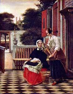 Де Хоох. Иной жизненный и творческий путь прошел Питер де Хоох (1629 — после 1683 г.), бытовая живопись которого носит созерцательно-лирический характер. В ней господствуют темы повседневного бюргерского быта. Внимание художника в равной мере распределяется на изображении спокойно-медлительных людей и интерьеров уютных маленьких комнат с многочисленными деталями обстановки, на игре света, льющегося через открытые окна и двери из чистеньких двориков и садиков. Картины «Хозяйка и служанка» (ок. 1657 г., Ленинград, Эрмитаж) и «Кладовая» (ок. 1658 г., Амстердам, Рейксмузеум), выдержанные в теплом колорите, с преобладанием золотистых тонов, привлекают поэтическим обаянием, симпатиями к простому человеку. Поздние работы художника, неглубокие по образным решениям, утрачивают демократизм, следуя патрицианским вкусам.
