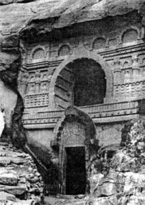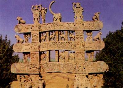 Каменная ограда вокруг ступы в Санчи, возведенная в 1 в. до н. э. по типу сельской ограды, имела четверо ворот, сплошь покрытых скульптурами.