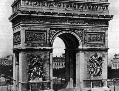 Поставленная на возвышении пологого холма, начинающегося у Елисейских полей, она завершает грандиозную панораму города. Арка, решенная в крупных формах с учетом рассмотрения ее на большом расстоянии, несет печать торжественности, парадности. Гладь стен подчеркнута усложненными тематическими скульптурными композициями.