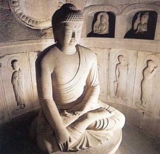 Принятие буддизма повлекло за собой строительство пещерных храмов, выполненных в смешанных традициях индийских и китайских скальных монастырей. Самый крупный пещерный храм 8 в.— вырубленный в склоне горы Соккурам (742—764), стены которого украшены многочисленными рельефами. Гармония и ритм архитектурных пропорций, виртуозно выложенный мощными гранитными плитами полусферический купол ставят Соккурам в единый ряд с лучшими храмами Восточной Азии.
