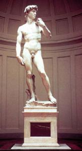 Глубокая убежденность, волнение устремленного па подвиг человека захватывают в статуе Давида (Флоренция, Академия изящных искусств), исполненной в 1501—1504 гг. по возвращении скульптора во Флоренцию. В образе легендарного героя нашла воплощение идея гражданского подвига, мужественной доблести и непримиримости. Микеланджело отказался от повествовательности своих предшественников. В отличие от Донателло и Верроккьо, изображавших Давида после победы над врагом, Микеланджело представил его перед боем. Он сосредоточил внимание на волевой собранности и напряженности всех сил героя, переданных пластическими средствами. В этой колоссальной статуе ясно выражена особенность пластического языка Микеланджело: при внешне спокойной позе героя вся его фигура с могучим торсом и великолепно моделированными руками и ногами, ого прекрасное вдохновенное лицо выражают предельную собранность физических и духовных сил. Все мускулы кажутся пронизанными движением. Искусство Микеланджело вернуло наготе тот этический смысл, каким она обладала в античной пластике.