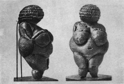 В эпоху верхнего палеолита развивается резьба на камне, кости, дереве, а также круглая пластика. Древнейшие статуэтки животных - медведей, львов, лошадей - отличаются точным воспроизведением основных объемов, передают фактуру некоторых материалов, например, шерсти. С культом «прародительницы» и «владычицы стихии» связаны изображения тучных обнаженных женщин, иронически названных «венерами» (статуэтка из Виллендорфа, Австрия).