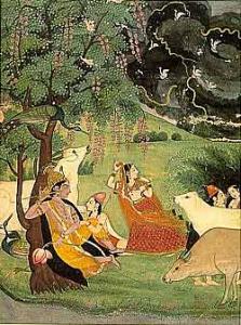 Мифологические герои, изображенные яркими локальными красками, Шива, божественный пастух Кришна со своими стадами, сцены любви и весеннего цветения стали основной тематикой наивной и радостной раджпутской миниатюры. Рассчитанные на более демократические круги, чем могольские, миниатюры местных школ просты и незатейливы по своему художественному строю и тесно связаны с народными ремеслами, узорами тканей, набойкой. Красочная раджпутская миниатюра пережила могольскую, оказавшись ближе к народному искусству.