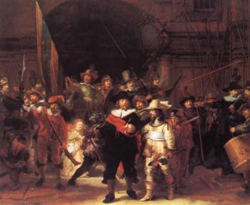 С углублением реалистического мастерства художника нарастали его разногласия с окружающей буржуазно-патрицианской средой. В 1642 г. по заказу роты стрелков он написал большую картину (3,87X-5,2 м), в связи с потемнением от времени красок получившую позже название «Ночной дозор» (Амстердам, Рейксмузеум).