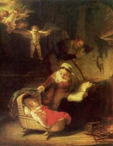 Казалось бы, в простых обыденных сценах, в скупых и точно найденных жестах и движениях художник раскрывает всю сложность душевной жизни, течение мыслей, героев. Место действия картины «Святое семейство» он переносит в бедный крестьянский дом, где плотничает отец, а молодая мать заботливо охраняет сон младенца. Каждая вещь здесь овеяна дыханием поэзии, подчеркивает настроение тишины, покоя, умиротворенности. Этому способствуют мягкий свет, озаряющий лица матери и младенца, тончайшие оттенки теплого золотистого колорита.