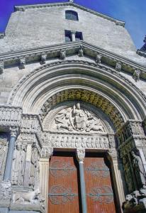 Это зальный невысокий малоосвещенный храм, с простым планом, с маловыступающим трансептом, со слабо развитым хором, обрамленным лишь тремя капеллами. Почти равные по высоте, три нефа перекрыты полуцилиндрическими сводами и общей двускатной крышей. Центральный неф погружен в полумрак — свет проникает в него через редко расположенные окна боковых нефов. Тяжеловесность форм подчеркнута приземистой трехъярусной башней над средокрестием. Нижний ярус западного фасада расчленен порталом и двумя полуциркульными арками, уходящими в толщу стены. Движение вверх, выраженное небольшими островерхими башнями и ступенчатым фронтоном, останавливается горизонтальными фризами со скульптурами святых. Богатая орнаментальная резьба, типичная для школы Пуату, стелется по поверхности стены, смягчая суровость сооружения.