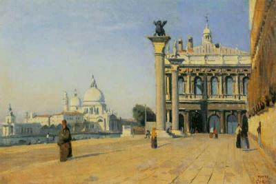 Ранние пейзажи Коро с их утверждением материального мира, написанные во время путешествия в Италию, отличаются подчеркнутой объемностью предметов, уравновешенностью масс, ясностью цветовых отношений, вниманием к изображению воздушной среды. Это главным образом городские пейзажи, архитектурные памятники. Таково «Утро в Венеции» (ок. 1834 г., Москва, ГМИИ), где лучи солнца освещают резко очерченные в прозрачном воздухе беломраморные здания. Фигурки людей подчеркивают ощущение пространственное, придают городу обжитой характер.