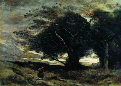 Коро. Особое место в пейзажной живописи Франции занимал Камиль Коро (1796—1875). Он был значительно старше барбизонцев, творчество его получило более ярко выраженную лирико-поэтическую направленность. Стремясь к созданию эмоционально насыщенного, реалистического обобщенного образа природы, Коро выражал в нем свои чувства и настроения. Главным средством, дающим произведению жизнь, он считал свет — спокойно-рассеянный, тончайший свет пасмурных дней, который царит в его пейзажах зрелого и позднего периода.