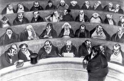 Министры и члены парламента сидят амфитеатром, уподобляясь редкостной коллекции чудовищ. Портретное сходство ясно обнаруживается в литографии «Мы все честные люди, обнимемся» (1834), где изображены видные политические деятели Июльской монархии во главе с Луи-Филиппом. И здесь художник разоблачает взаимный обман, надувательство, лицемерие, фальшивую частную и общественную мораль буржуазного общества.