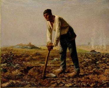 Тему непосильного труда развивает художник в картине «Человек с мотыгой» (1863, Париж, Лувр), где образ крестьянина-бедняка, опирающегося на свое примитивное орудие — мотыгу, возвышается на фоне неба и заросшего поля, которое он обрабатывает. Усталость и изнеможение написаны на его лице и на всей фигуре, массивной и угловатой. «Это хлеб в поте лица, это крик земли, я знаю это по себе...— писал Милле,— но именно в этом я и нахожу подлинную человечность и большую поэзию».
