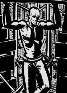 С калейдоскопической быстротой в листах Мазереля сменяются вздымающиеся вверх, теснящие человека гигантские небоскребы, дымящие фабричные трубы, хаос автомобилей, фантасмагория сверкающих реклам и витрин магазинов, бестолковая суета массы спешащих людей, фешенебельные кварталы, зловещие трущобы и т. д. И все же человек не поглощается окружающей его средой. Горой Мазереля — работник-интеллигент, строитель, полон энергии, обуреваем высокими идеями, способен к ярким переживаниям. Подавленный одиночеством, он вступает в конфликт с обществом, испытывает превратности жизни, мужает, побеждает и ликует или гибнет. Для Мазереля (с конца 1900-х гг.) становится характерным в гравюрах жанр «романа в картинках». В них он раскрывает жизнь в сложных конфликтах и контрастах, повседневных и героических аспектах. «Страдания человека» (1918) —это поэтически-взволнованная повесть о внутреннем росте задавленного пролетария, который в трагической борьбе с жизнью в капиталистическом обществе становится героем-революционером. Финал серии — композиция «Расстрел». Одинокая фигура рабочего с гордым сознанием независимости противостоит невидимым врагам. Она воспринимается как символ мужества тех, кто победит в борьбе за справедливое будущее. Резкие контрасты черного и белого рождают трагический пафос листа, увековечивающего героя. Художник не описывает, а дает большие социальные обобщения, часто в одной фигуре, в одном факте выражает сложное содержание жизни, сочетает иронию, доходящую до гротеска, со светлой романтикой.