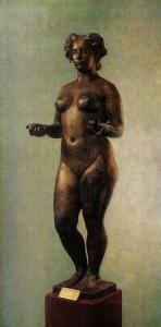 Майоль. Другая линия в реалистической скульптуре этого времени представлена Аристидом Майолем (1861—1944)—глубоким созерцателем природы, стремившимся вернуть скульптуру к ее античным истокам, сохранить свежесть и остроту восприятия мира. Исполненный глубокого благоговения перед натурой, он верил в человека, его благородную естественную красоту и выражал совершенной пластикой обнаженного тела гармоничную цельность, ясность и спокойствие духа. Майоль отказался от сложных сюжетов, от разнообразия тем, его излюбленный образ — женщина, исполненная чистоты, здоровья, безмятежности. Он изображал ее полнокровной, цветущей, как бы олицетворяющей вечные силы природы. Такова «Помона» (1907, Москва, ГМИИ; Прага, Национальная галерея) с отяжеленными, плотными, но мягко круглящимися упругими формами. Тончайшая передача ритма, пронизывающего формы, и изгибов замкнутого четкого силуэта подчинена целому — архитектонике тела, крупным, весомым, уравновешенным массам. Непре¬рывно льющаяся плавная контурная линия, охватывая формы, сообщает им движение и вместе с тем выделяет, обособляет их в пространстве. Круглая скульптура Майоля оживает в условиях пленэра на фоне зелени, образует как бы единую сюиту, проникнутую общим настроением и ритмом (статуи в саду Тюильри в Париже).