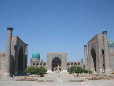 На площади Регистан в Самарканде было воздвигнуто медресе Улугбека (1417—1420). Планировка медресе в значительной мере объяснялась замкнутым характером высшего мусульманского учебного заведения, в котором студенты не только учились, но и жили. Открытый прямоугольный двор окружен двухэтажными зданиями, где расположены кельи для учащихся. Они выходят во двор открытыми лоджиями. В середине каждой стены высятся четыре айвана, служившие местом для занятий. Медресе Улугбека отличается стройностью пропорций, единством архитектурных форм и изысканной красотой мозаик, сохранивших более чем за пять веков своего существования всю прелесть и свежесть чистых красок.