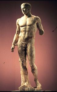 Поликлет. К началу второй половины 5 в. до н. э. художественная жизнь процветала не только в Афинах, но и в других городах. Из Аргоса (Пелопоннес) происходил современник Фидия Поликлет, в искусстве которого проявился особенный интерес к изображению спокойно стоящего человека. Самая прославленная статуя Поликлета — «Дорифор» («Копьеносец», сер. 5 в. до н. э., Неаполь, Национальный музей), совершенное воплощение мужественного идеала доблестного гражданина-воина.
