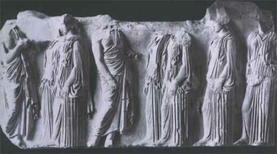 На этом же принципе построен фриз, или зофор, сплошь покрытый лентой рельефов с изображением праздничного шествия, посвященного Афине (часть фриза с изображением богов теперь хранится в Афинах, в Музее Акрополя, часть — в Лондоне, в Британском музее, «Девушки» — в Париже, в Лувре).