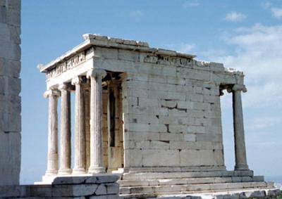 Смысл планировки Акрополя можно попять, лишь представляя движение торжественных процессий в дни общественных празднеств. Шествие поднималось на Акрополь с запада. Дорога вела вверх, к торжественным воротам — Пропилеям (437—432 гг. до н. э., архитектор Мнесикл). Обращенную к городу мощную дорическую колоннаду Пропилеи обрамляют два неравных, но взаимоуравновешенных крыла здания, к правому, меньшему крылу прилегает храм Ники Аптерос (между 449—420 гг. до н. э., архитектор Калликрат). Этот небольшой по размерам, гармоничный и ясный по форме храм, словно отделившись от общего массива холма, первым встречал процессию. Стройные ионические колонны на каждой из двух коротких сторон храма (по типу — амфипростиля) придают зданию черты изящества.