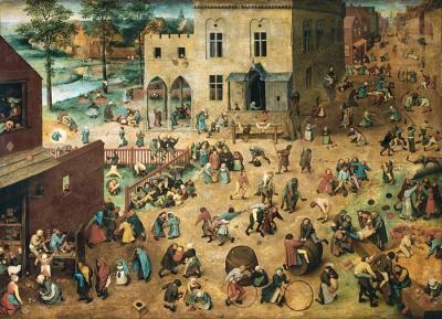 Каждая фигура получает смысл лишь в связи с другими. Охваченные весельем люди находятся в непрерывном движении, но за праздничной яркостью жизни чувствуется ирония и горечь художника, Брейгель видит не только забавное, но и безобразное, гротескное — жизнь кажется ему бессмысленной суетой. Высоко поднимая горизонт, увеличивая таким образом угол зрения, он показал события с дальнего расстояния, охватывая их многообразие. В полной бурного движения картине «Игры детей» (1560, Вена, Художественно-исторический музей) показаны характерные виды игр того времени. Художник выступает как рассказчик, обладающий исключительным даром характеристики. Сцена представлена как случайный фрагмент большого целого: плоскость картины равномерно заполнена равнозначными эпизодами, проходящее через композицию движение мыслится и за пределами картины. Брейгель передает жизнь в ее текучести и становлении; он фиксирует только мгновение вечно изменчивой жизни.