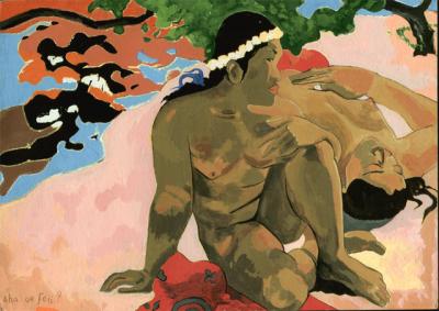 Декоративно-живописные достоинства полотен Гогена достигнуты ценой отвлечения от реальных конфликтов жизни. Утверждение некоего идеала первобытной гармонии, идеализация патриархальных архаических форм жизни — характерные черты творчества Гогена («Женщина, держащая плод», Ленинград, Эрмитаж). Массивные фигуры таитянок полны достоинства, наделены своеобразной грацией и чрезвычайно пластичны. Скульптурно совершенны стройные фигуры двух женщин, объединенных компактной пирамидальной композицией в картине «А ты ревнуешь?» (1892, Москва, ГМИИ). Их смуглые тела с отсветами солнца гармонируют с розовым песком, органически вписываются в пейзаж.