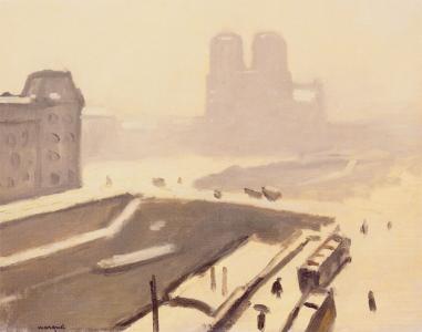 Марке. В ином направлении развивалось творчество Альбера Марке (1875—1947), вначале примыкавшего к «диким», в дальнейшем ставшего наиболее последовательным представителем реализма в европейском пейзаже первой половины 20 в. Его живопись открывала поэзию индустриального городского пейзажа с характерными для 20 в. приметами — мостами, шлюзами, буксирами, товарными пароходами, подъемными кранами, шумными набережными, уходящими в глубь моря причалами. Он любил изображать воду спокойную или покрытую легкой рябью. В его пейзажах изображены порты Франции, а также Египта, Туниса, Алжира. Особенно часто мотивами его произведений становился Париж с его историческими зданиями, Сеной и мостами. Искусство Марке искренне, глубоко человечно. Природа в ее повседневности встает в его полотнах преображенной рука¬ми человека. В картине «Собор Парижской богоматери» (1910, Ленинград, Эрмитаж) тонко переданы влажный воздух, смягчающий очертания масс собора Парижской богоматери, мягкий зеленоватый тон вод Сены. Портретная точность в изображении местности сочетается с большим лаконизмом целого.