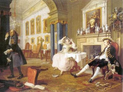 «Карьера мота» (восемь картин) рассказывает о внезапно разбогатевшем юноше, который получил наследство и растратил его в кутежах, а затем попал в дом умалишенных. «Модный брак», наиболее значительная по глубине замысла серия Хогарта, состоит из шести полотен; это правдивая и поучительная история брака по расчету, своего рода живописный «роман нравов». Отдельные персонажи олицетворяют здесь, по существу, целые социальные группы и их взаимоотношения. Открывает серию картина заключения брака, фактически уподобленного торговой сделке разорившегося графского сынка и дочери богатого торговца. Со скучающим видом отвернулись друг от друга молодые, в то время как их родственники оформляют брачный контракт. Картина «Вскоре после свадьбы» продолжает повествование; в ней каждая деталь свидетельствует о бессмысленности существования супружеской четы, о безразличии молодых супругов друг к другу, о кутежах и развале дома, из которого управляющий выносит пачку неоплаченных счетов. Серию завершает трагическая развязка — гибель ее героев. С удивительным мастерством передает Хогарт последовательность хода событий, раскрывает характеры действующих лиц, их взаимоотношения, нравы, привычки. По его картинам можно писать целые рассказы. Каждая из картин — законченное самостоятельное произведение, все вместе они объединены одной идеей и дополняют друг друга. Художник заостряет внимание на узловых моментах повествования, усиливая достоверность изображаемого воссозданием конкретного места действия. Он прибегает к неожиданно резким сопоставлениям и тяготеет к анализу. Остро и насмешливо наблюденные детали позволяют угадывать события, предшествующие и последующие. Гармония мягких розоватых, серебристых, оливковых тонов способствует передаче внешнего благосостояния внутренне опустошенного мира, обреченность которого находит выражение в суматошном ритме линий, пронизывающем композиции.